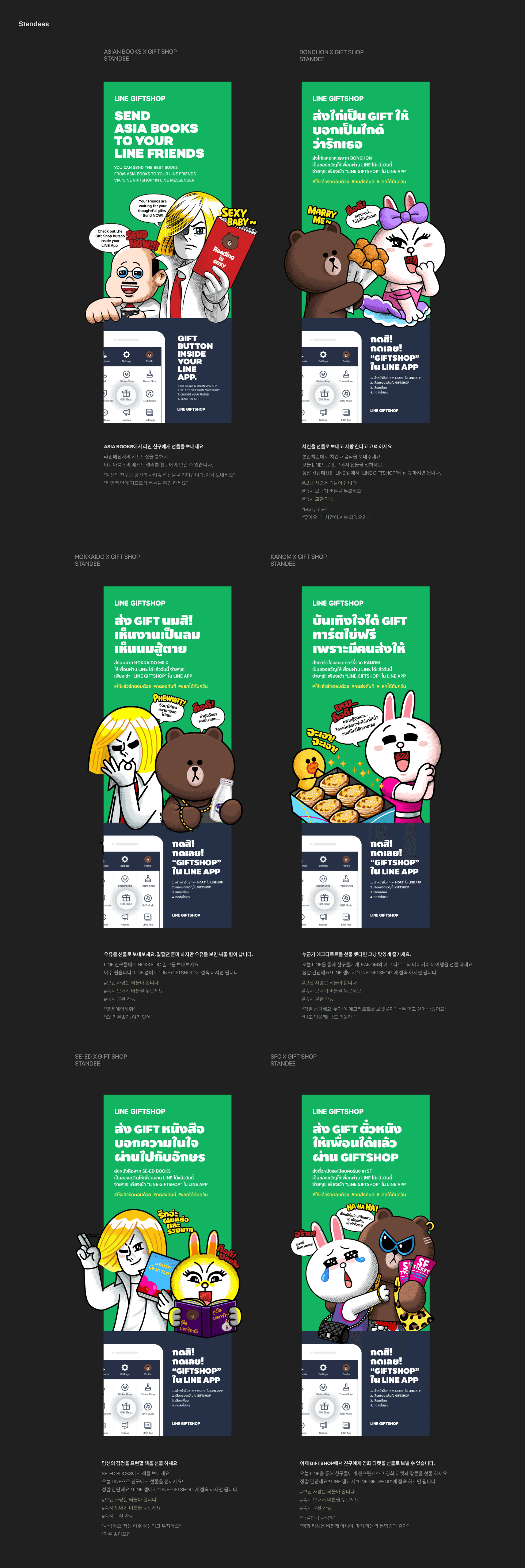 또한 각 소재의 메시지는 제휴 브랜드 제품 특성을 활용해 모바일 선물 발송 상황을 유머러스하게 표현 했으며, 오프라인 게재 환경을 고려해 제휴 브랜드보다 GIFTSHOP의 디자인 아이덴티티가 더욱 부각 되도록 구성 했습니다.