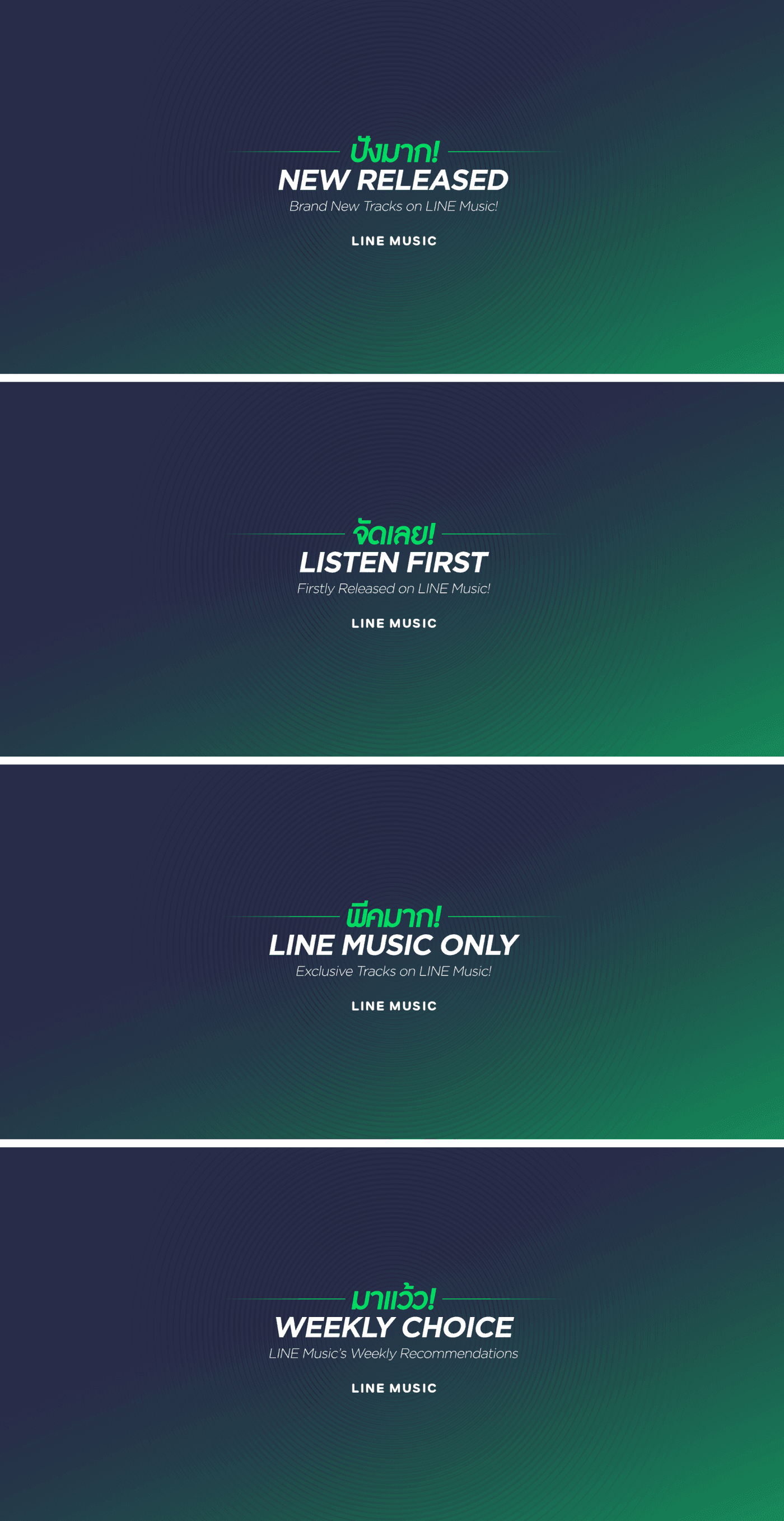 플랫폼을 직접 홍보하기보다, LINE Music에서 발매되는 음원을 중심으로 자연스럽게 플랫폼이 노출되는 방향을 설정했습니다. 이를 위해 제공되는 4가지 음원 카테고리를 브랜드화하고, 각 카테고리에 태국 현지 유행 신조어를 활용한 슬로건을 적용해 주목도를 높였습니다.