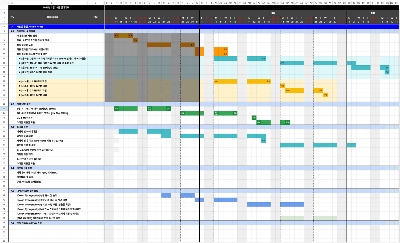 디자인 방향성 도출 이후 이를 제품에 반영 하기까지의 단계를 정의하고 유관부서와 협의를 진행 했습니다.