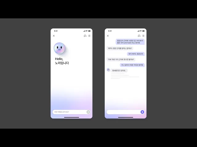 사용자가 질문을 입력하면 AI는 이에 대한 연산 작업을 진행합니다. 이 과정은 짧게는 1~2초, 경우에 따라서는 더 오래 걸릴 수도 있습니다. 이때 단순한 로딩 화면을 보여주는 대신, 노리가 사용자와 가벼운 대화를 나누며 기다림의 지루함을 완화하도록 구성했습니다. 동시에 시스템이 연산 중임을 시각적으로 표현하기 위해, 그라데이션 애니메이션 효과를 적용하여 재미와 생동감을 더했습니다.