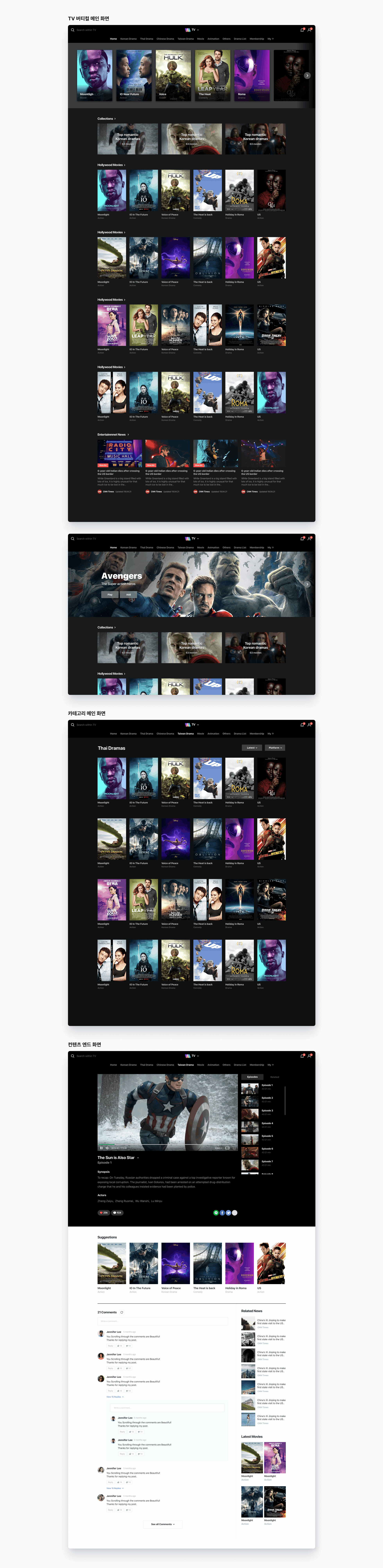 콘텐츠 엔드에서는 영상 콘텐츠 재생을 지원하며, 시리즈물의 경우 여러 에피소드를 연속 재생할 수 있는 재생 목록 UX를 제공 합니다. 또한 해당 콘텐츠와 유사한 다른 콘텐츠를 추천하는 ‘Related Movie’ 모듈과 관련 뉴스로 이동할 수 있는 ‘Related News’ 모듈을 배치하여, 타 버티컬로의 트래픽 순환을 유도했습니다.