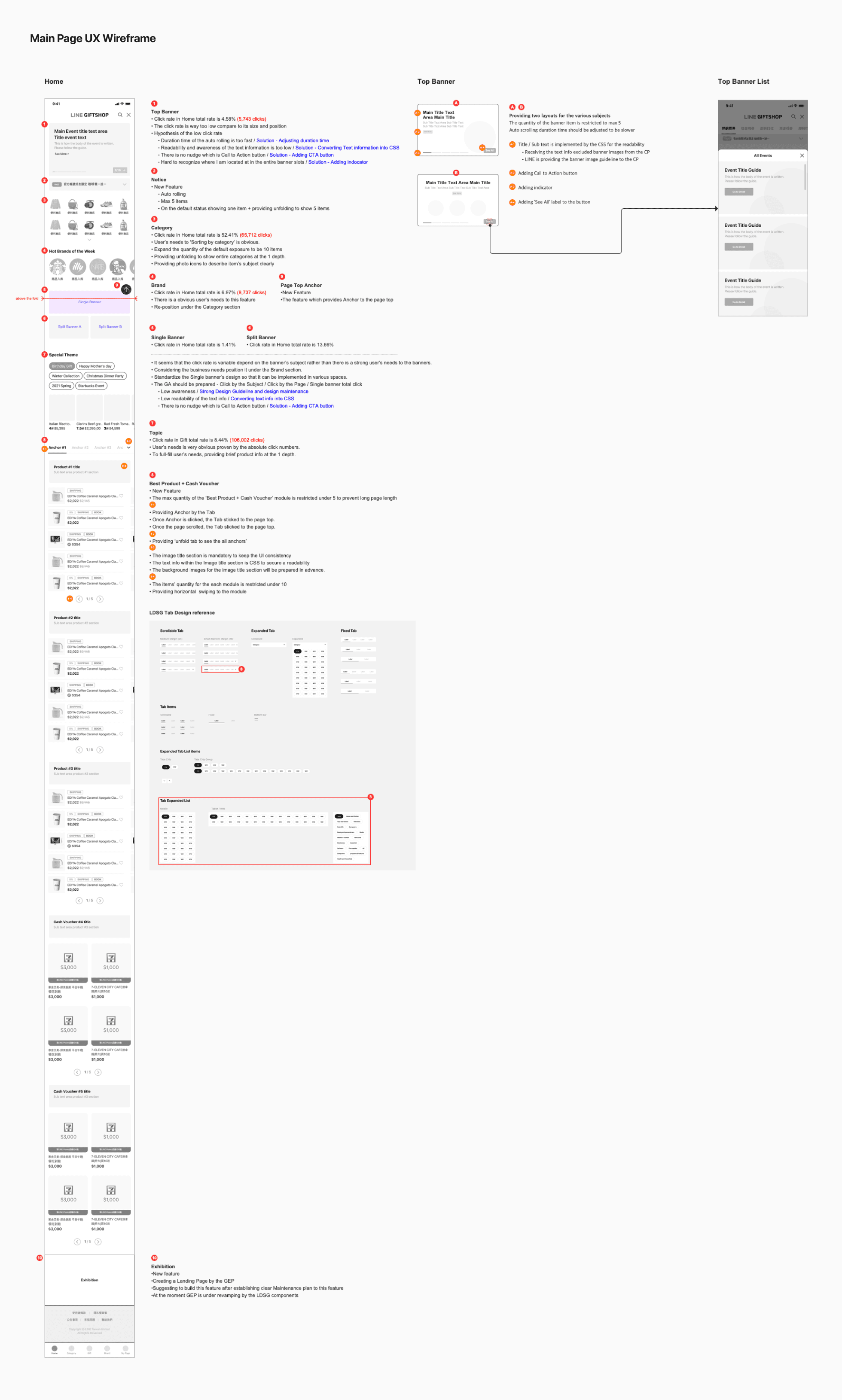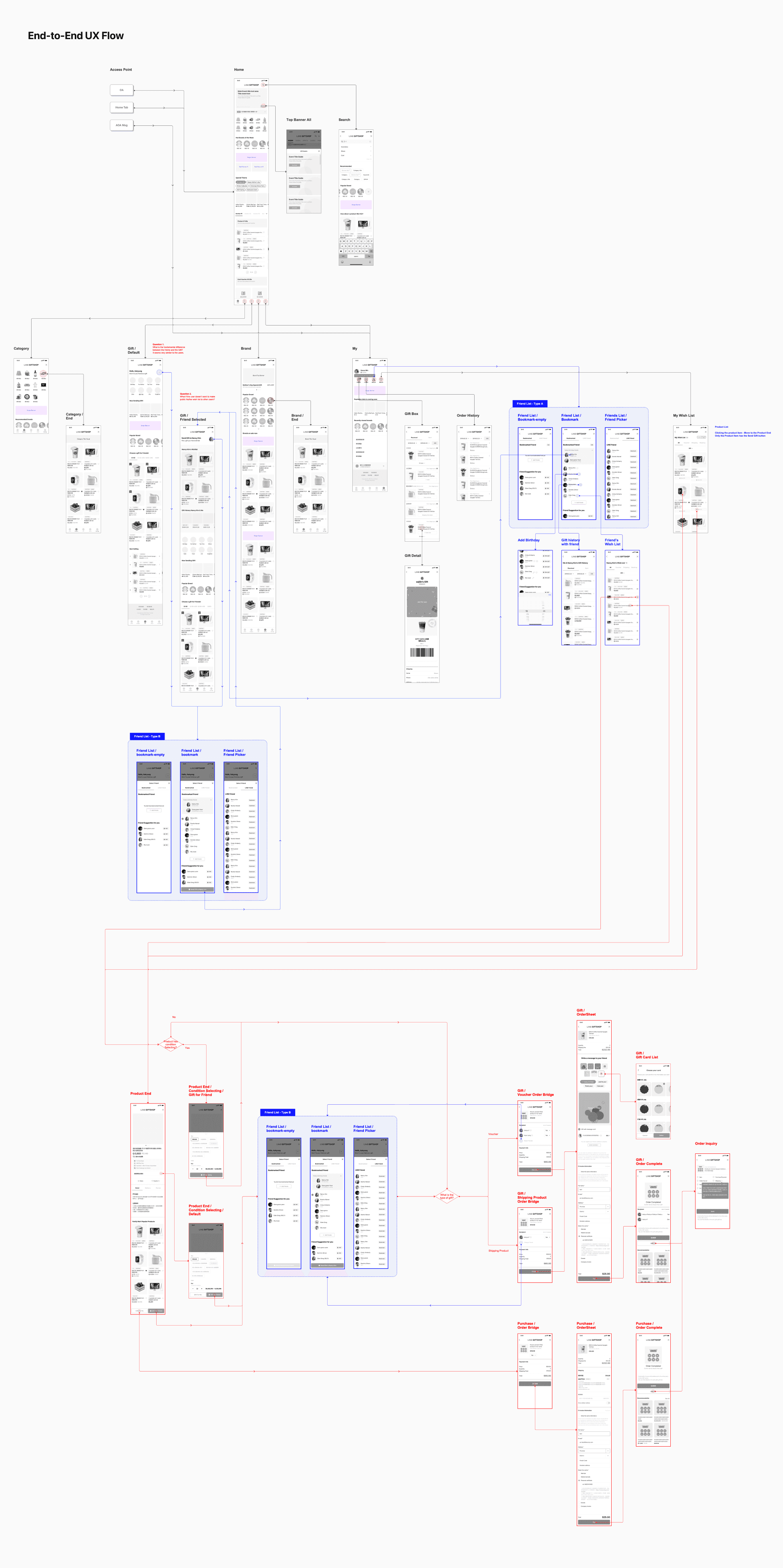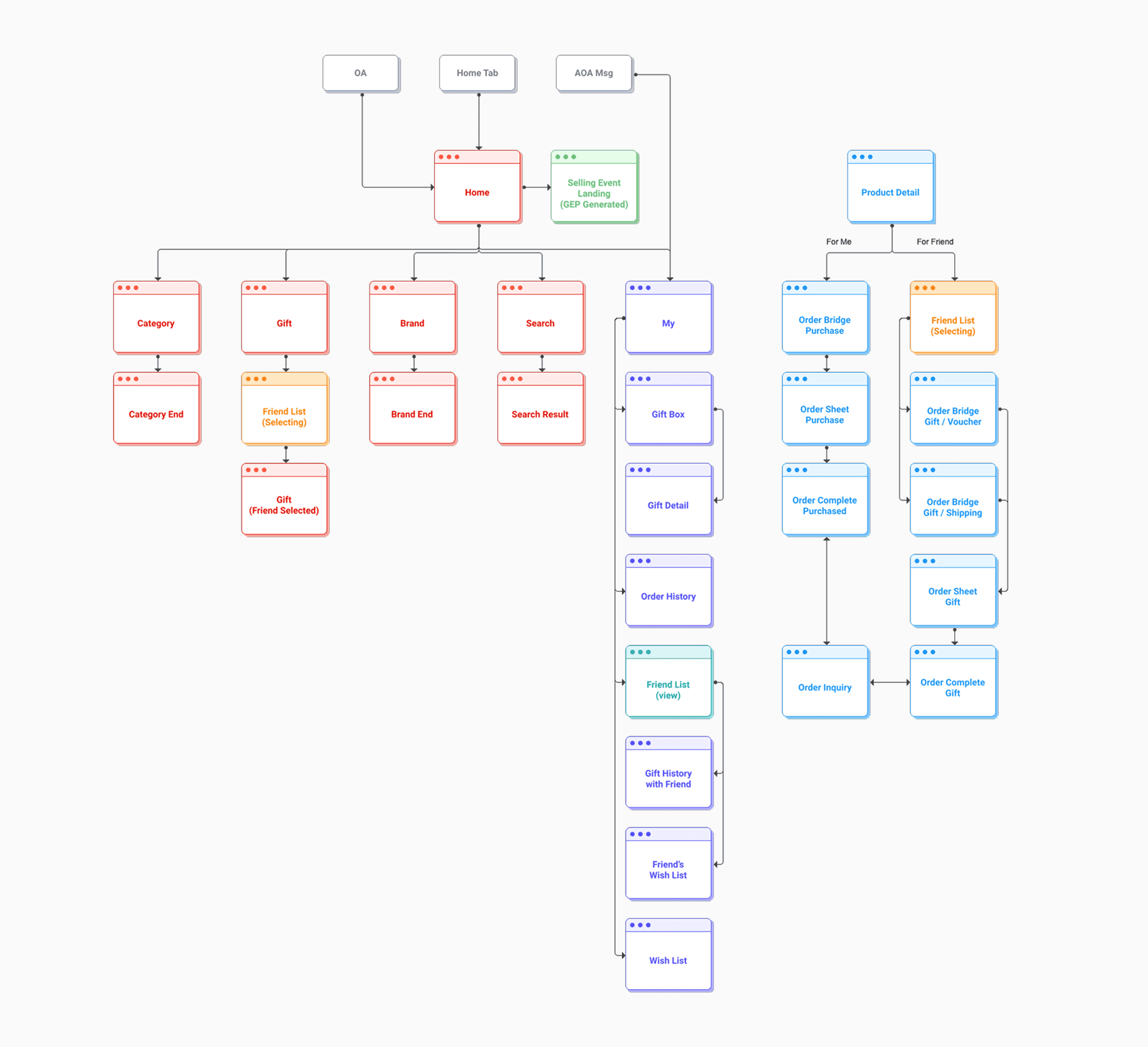 IA 구조를 정의한 이후에는 서비스 진입점에서 선물하기 완료까지 이어지는 전체 퍼널 UX 플로우를 설계 했습니다. 특히, 사용자가 어떤 진입점을 통해 기프트샵에 들어 오는지에 따라 유저의 유형을 정의 했습니다.