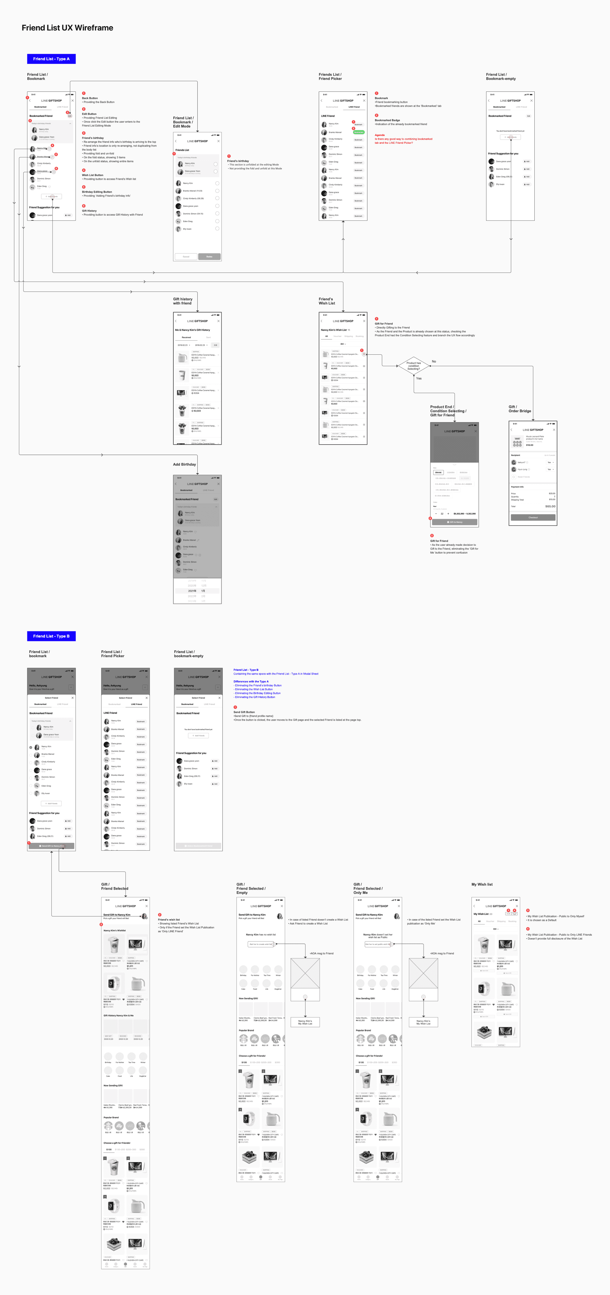 서비스 전반의 IA 구조 정의를 먼저 수행했습니다. 이 과정에서 전체 퍼널에서 반복적으로 사용 되어야 하는 섹션을 식별하고, 이를 재사용 가능한 구조로 설계 했습니다. 그 대표적인 예가 바로 라인의 친구 목록을 호출해 선택하는 과정, 즉 ‘Friend List’였습니다. IA 설계 과정에서 Friend List가 서비스 전반에서 반복적으로 사용 되어야 하는 핵심 기능임을 확인할 수 있었습니다.