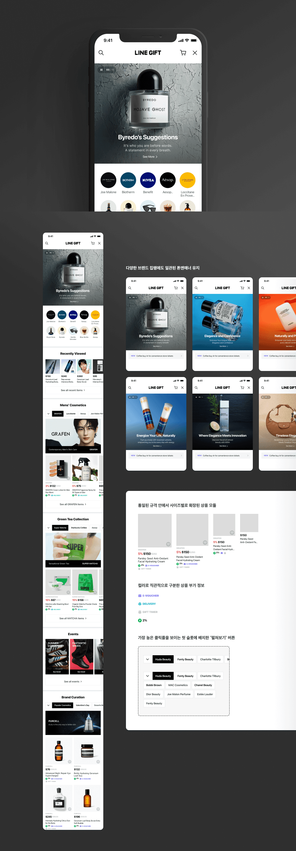 입점 브랜드의 고유한 비주얼 정체성이 훼손되지 않으면서 매력적으로 노출될 수 있도록 UX를 개선 하였습니다. 또한 여러 입점 브랜드가 동시에 노출 되더라도 기프트샵 플랫폼의 통일된 디자인 톤앤매너가 유지 되도록 설계 하였습니다.