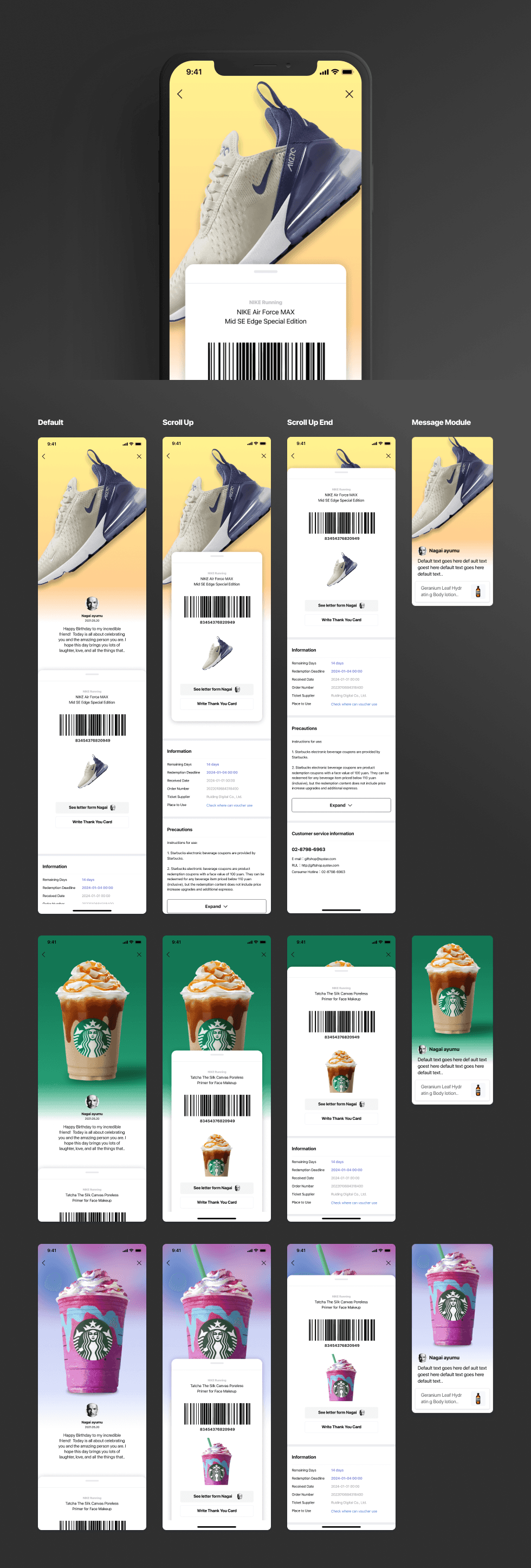 오프라인 매장에서 상품을 교환하는 순간까지 특별한 감동이 이어질 수 있도록 쿠폰의 시각적 완성도를 한층 강화하였으며, 선물을 보낸 사람의 메시지 카드를 쿠폰 내에 삽입하여 E-쿠폰 자체가 하나의 메시지 카드처럼 느껴지도록 설계 하였습니다.
