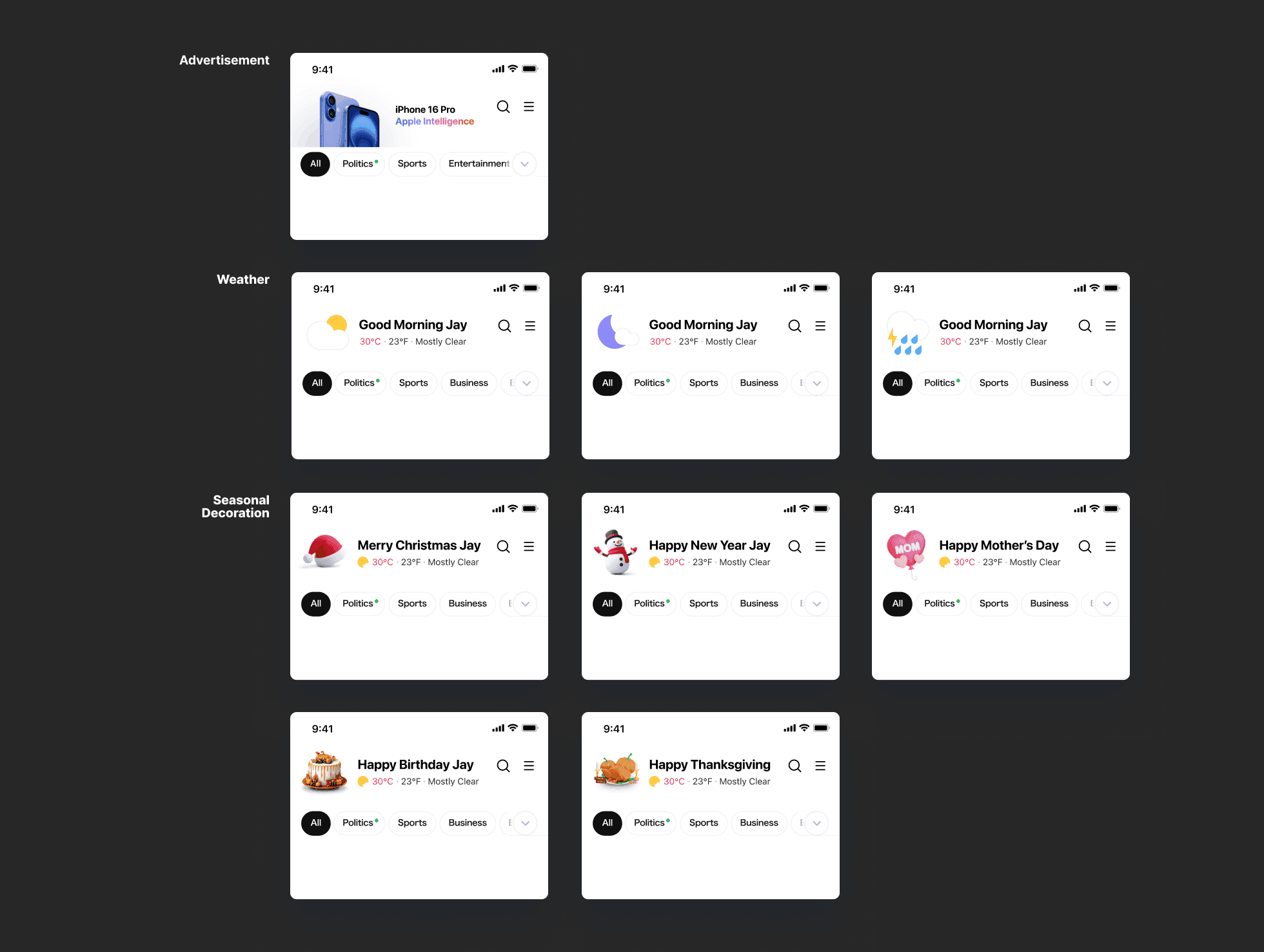 날씨 모듈은 사용자의 생일에 맞춰 생일 축하 메세지를 노출하는 메세지 보드, 특정 시즌이나 기념일에 맞춰 분위기를 조성하는 시즈널 데코레이션, 그리고 대형 광고를 위한 광고 보드로 활용 될 수 있도록 설계 했습니다.