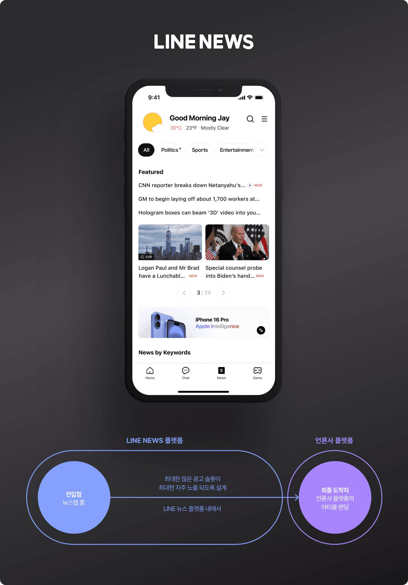 사업적 제약으로 인해 유저의 체류 시간이 가장 긴 아티클 랜딩은 LINE 플랫폼이 아닌 언론사 플랫폼으로 연결되어야 했으며, 이에 따라 광고 슬롯을 노출할 수 있는 구간은 아티클 랜딩 이전의 퍼널로 한정될 수밖에 없었습니다. 또한 뉴스 컨텐츠의 실제 소비 역시 언론사 플랫폼에서 이루어져야 했습니다.