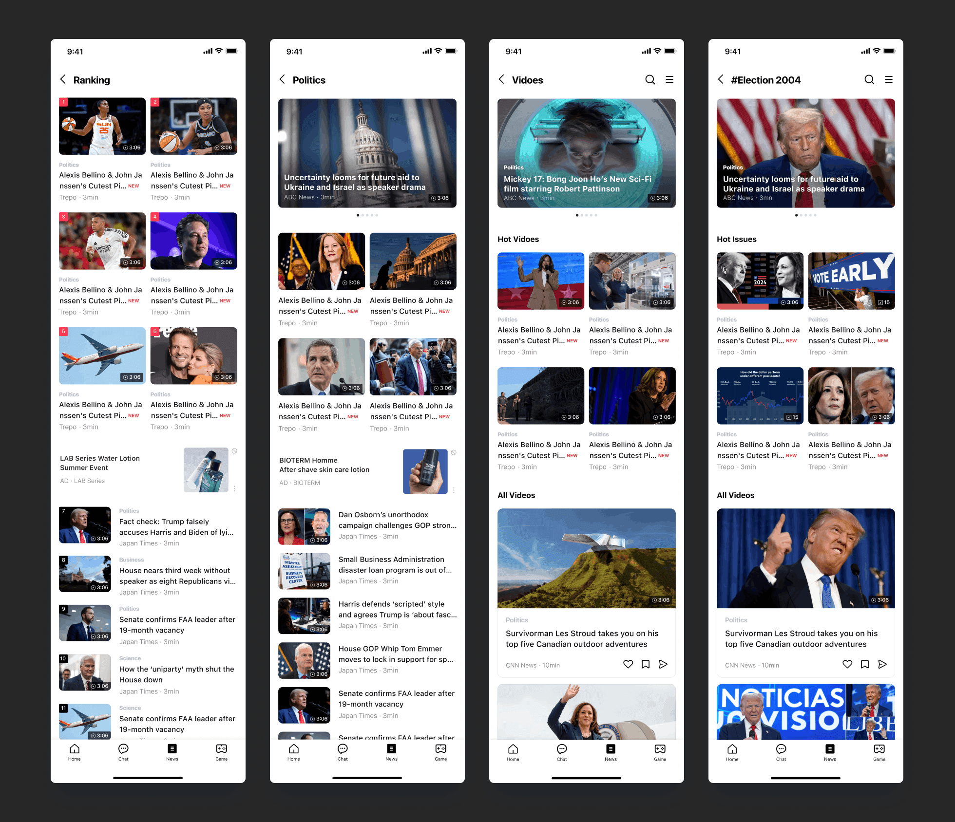 다양한 큐레이션 - 키워드, 언론사, 동영상, 포토 등 다양한 기준으로 뉴스 컨텐츠를 큐레이션하여, 홈 화면에서 여러 방식으로 뉴스를 탐색할 수 있도록 구성 하고, 이를 통해 홈 화면 체류 시간을 늘리고 광고 모듈의 노출 기회를 극대화 했습니다.