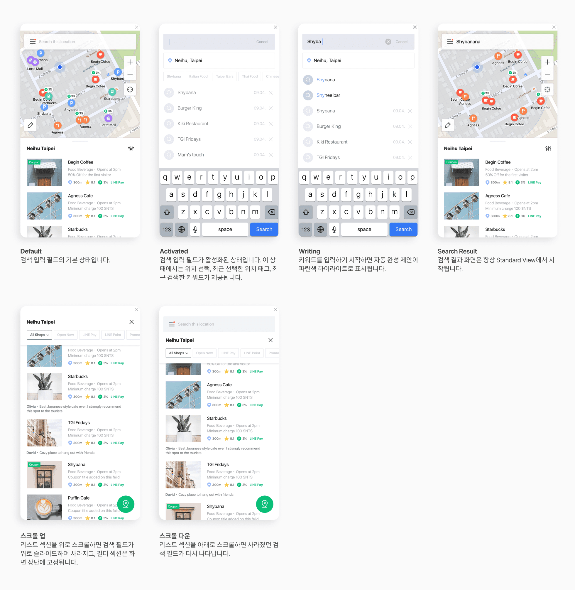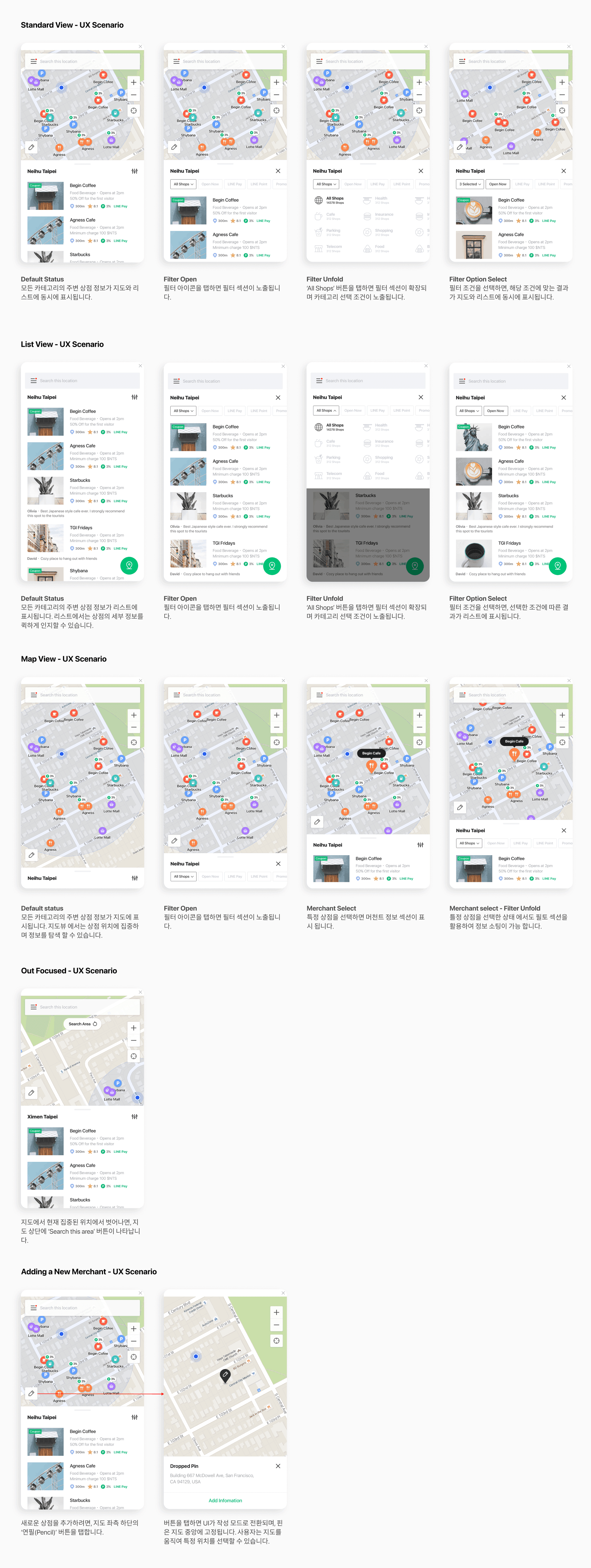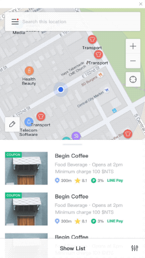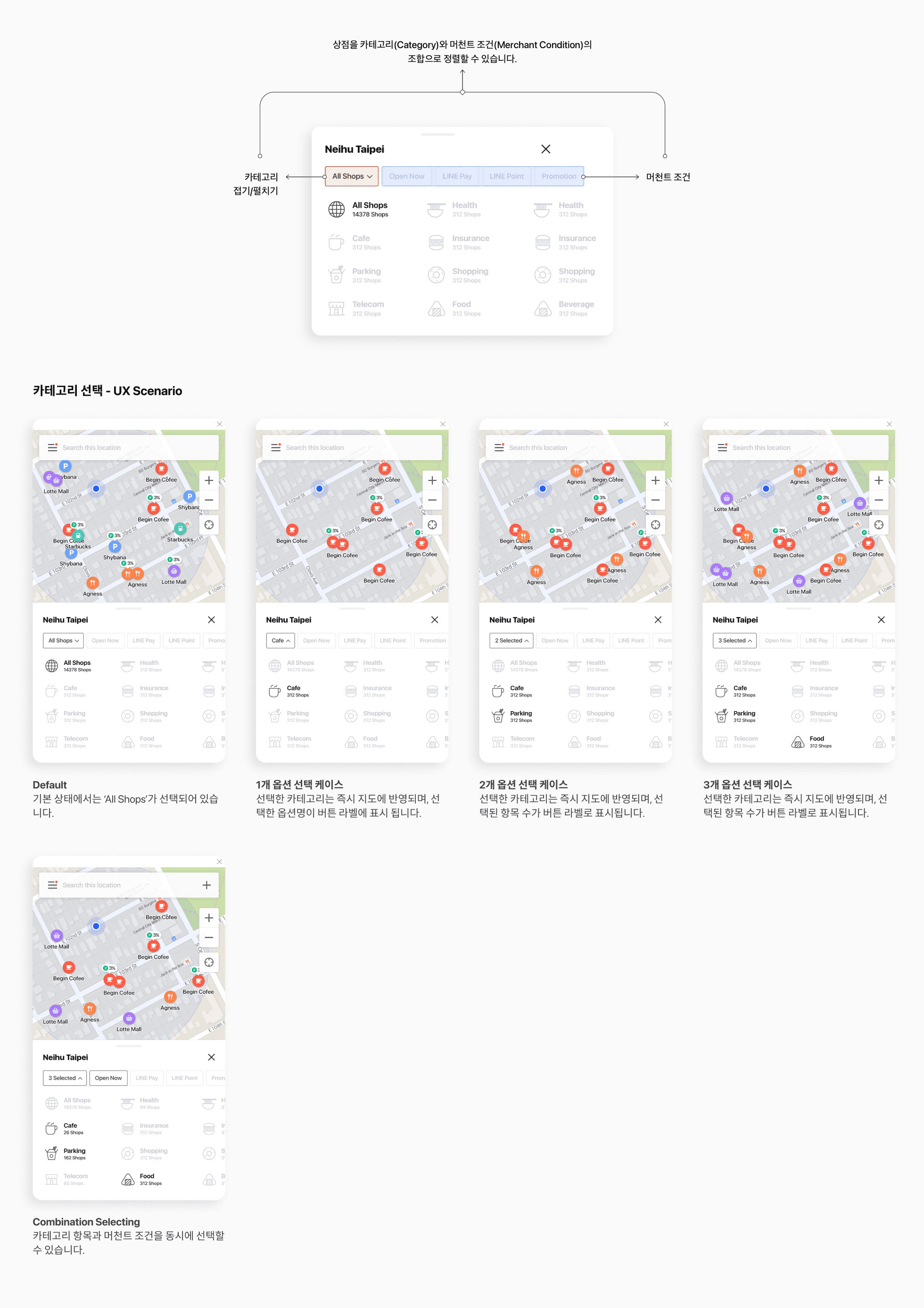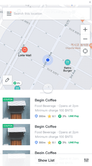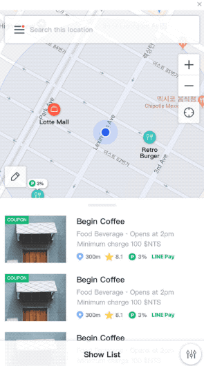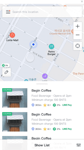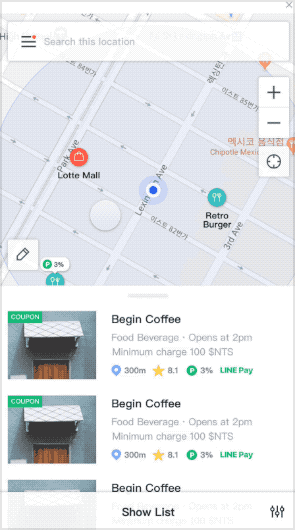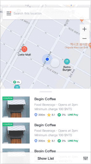 필터는 모든 뷰타입에서 일괄적으로 적용되는 범용 필터 입니다. 카테고리와 머천트 조건(오픈 여부, 라인페이 지원 여부, 프로모션 여부 등)을 동시에 조합 하여 정보를 소팅할 수 있도록 설계 하였습니다. 특히 사용 빈도가 높은 머천트 조건은 필터가 접힌 상태 에서도 ON/OFF 토글 방식으로 제공 되도록 하여, 편의성을 증대 하였습니다.