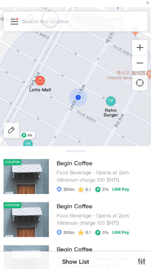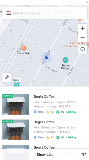 사용자가 지도 뷰에서 위치를 중심으로 탐색 할지, 리스트 뷰에서 머천트 세부 정보를 중심 으로 탐색 할지 선택할 수 있도록 지원했습니다. 또한 각 뷰타입 간 전환은 Press & Drag 방식으로 직관적이고 손쉽게 이루어 지도록 설계 했습니다.
