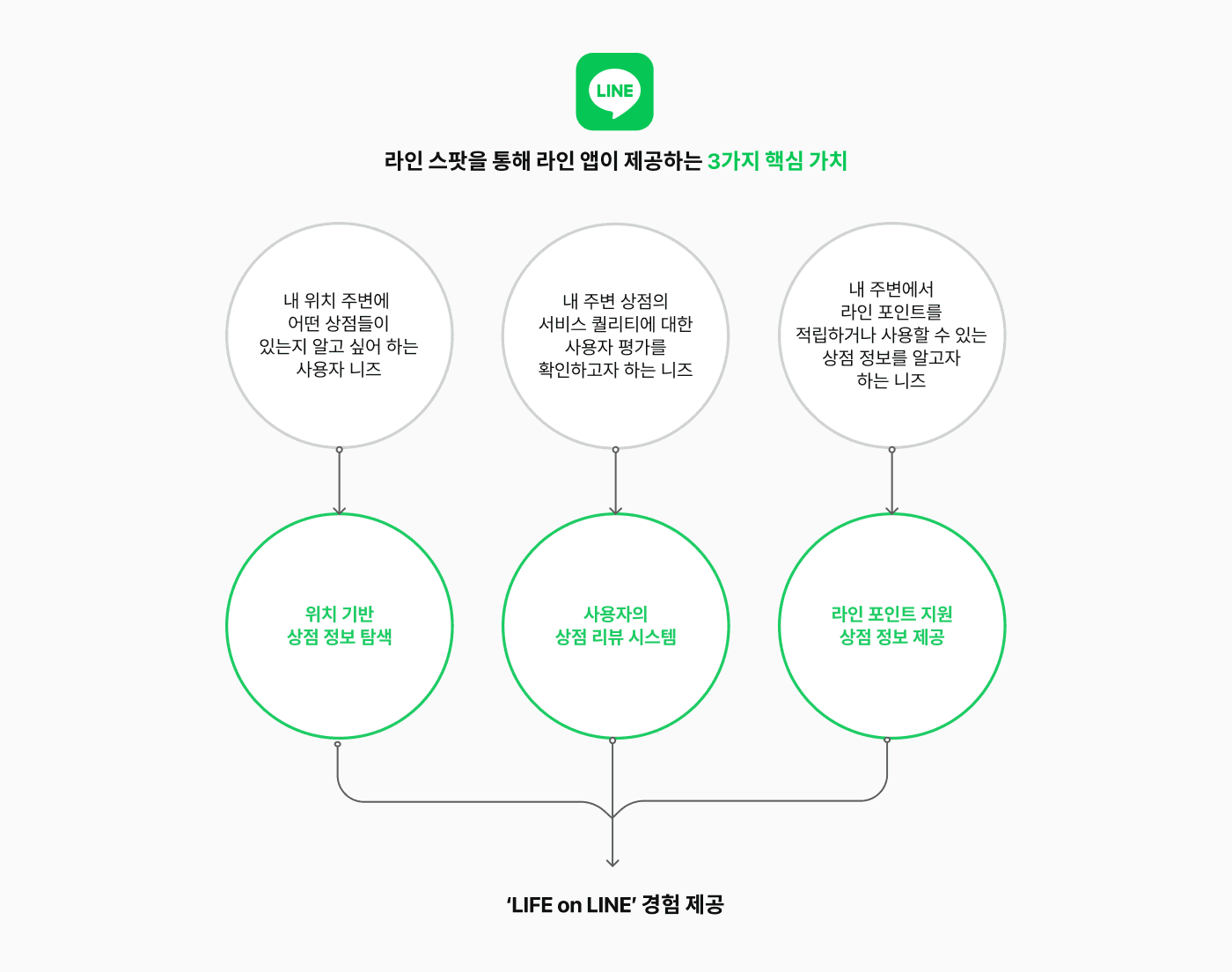 LINE Spot은 ‘LIFE on LINE(라인이 일상이 되는 세상)’이라는 슬로건 아래, LINE 앱 내에서 제공되는 POI 중심의 머천트 정보 서비스입니다. 사용자는 LINE 앱 내에서 자신의 위치를 기반으로 주변 오프라인 상점 정보를 탐색할 수 있으며, 점주들은 사업 규모와 관계없이 LINE 플랫폼을 통해 비즈니스를 노출할 수 있는 기회를 제공받습니다.