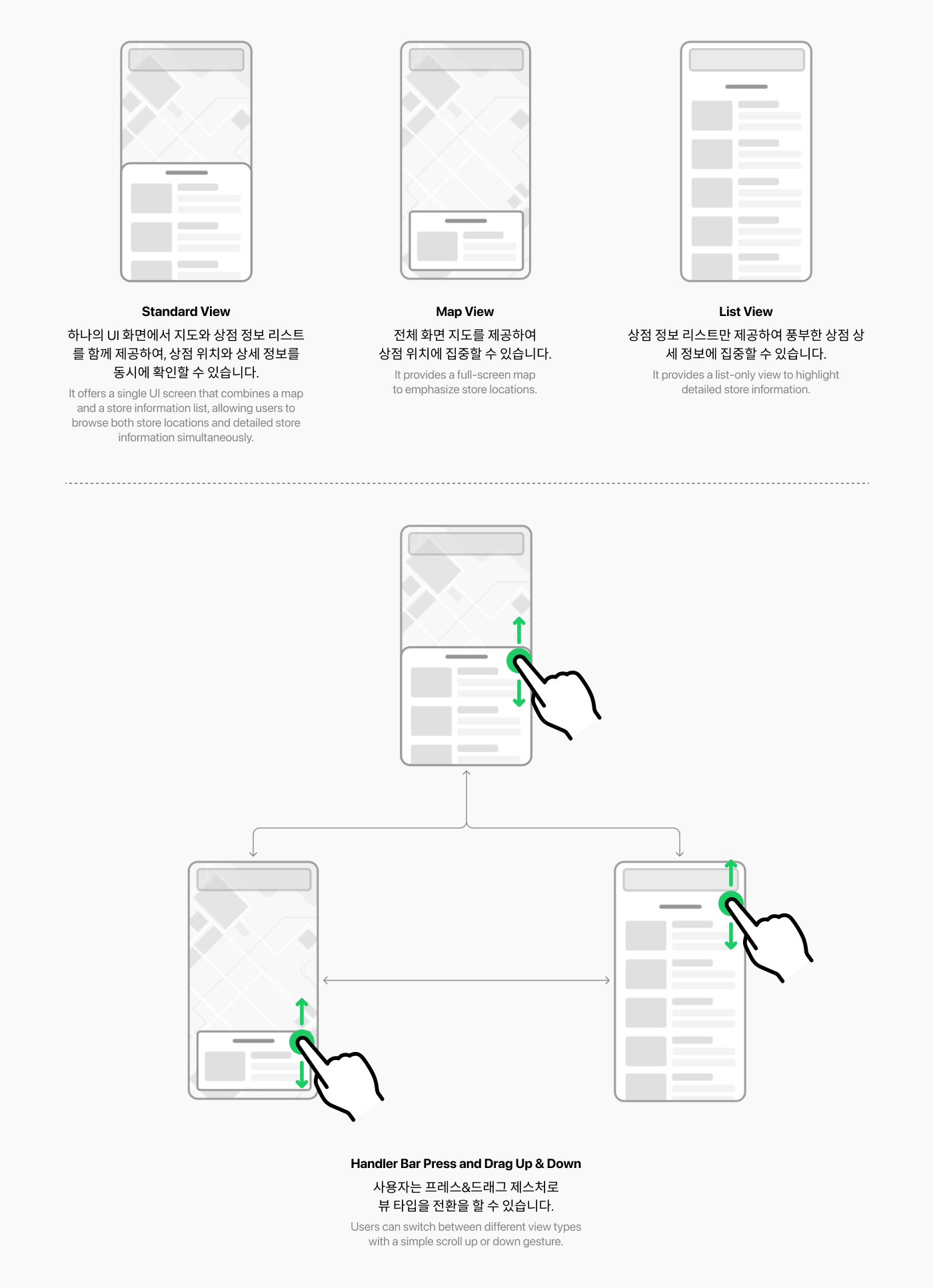 또한 각 뷰 타입을 간단한 프레스&드래그 제스처만으로 전환할 수 있도록 하였으며, 전환 과정에는 모션 효과를 적용하여 사용자가 전환 과정을 직관적으로 인지할 수 있도록 설계 하였습니다.