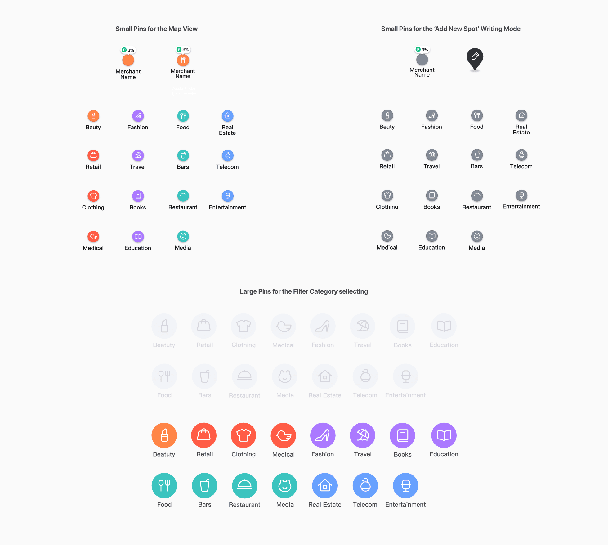 지도 뷰에서 표현되는 다양한 상점 유형을 시각적으로 명확히 구분할 수 있도록, 선명하고 직관적인 아이콘을 디자인하였습니다.