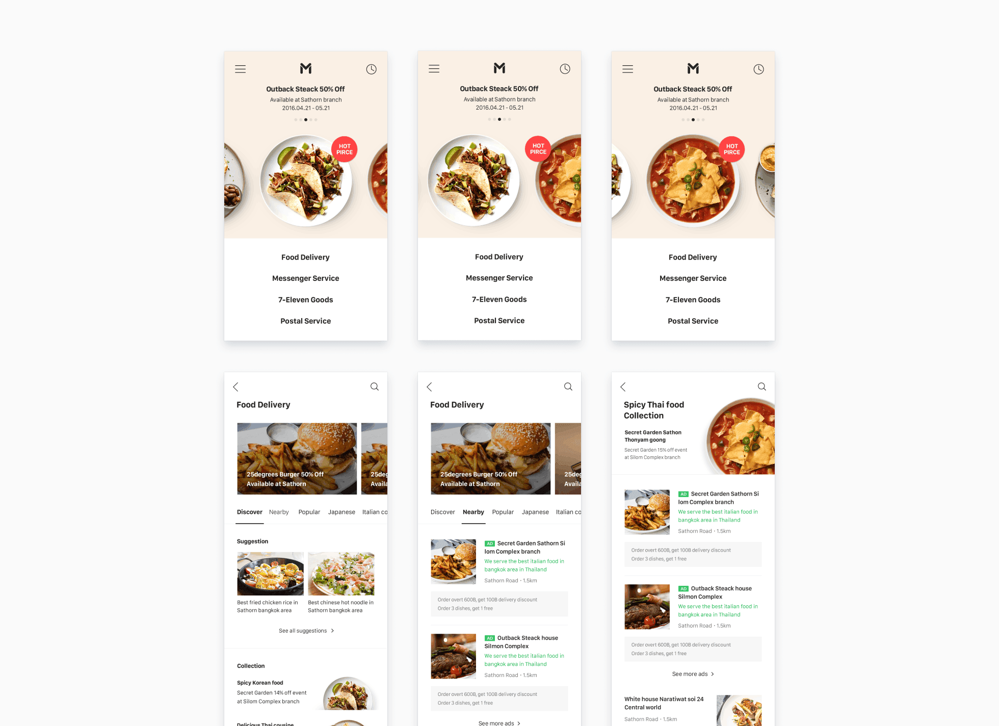 서비스 홈 화면에 4개의 주요 카테고리 진입점을 제공하면서도, 푸드딜리버리가 가장 시각적으로 부각 되도록 디자인 했습니다. 화면 상단에는 직접 촬영한 고퀄리티 음식 이미지를 배치해 시즌별 인기 메뉴를 직관적으로 노출하고, 식욕을 자극하는 비주얼 효과를 극대화 했습니다.