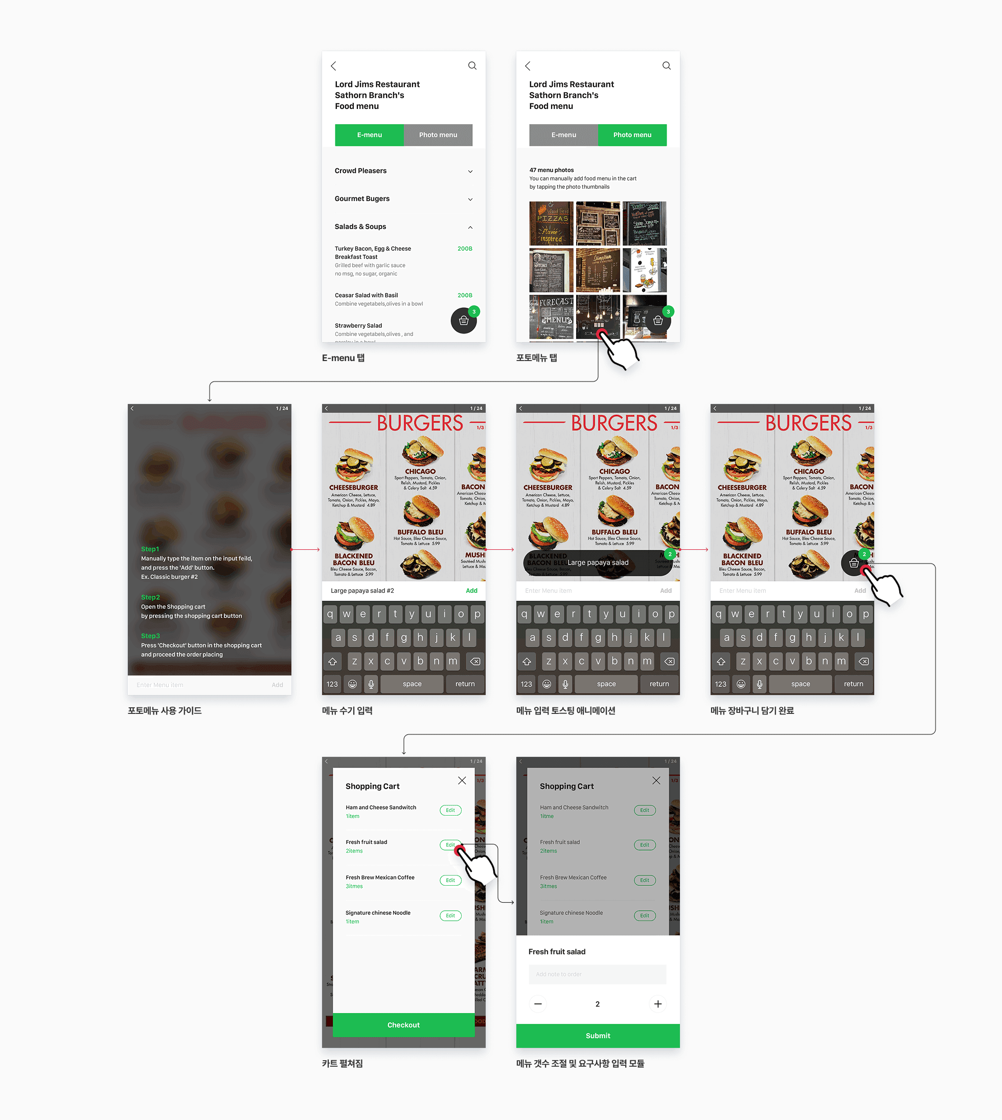 음식 주문 UX 개선을 위해 ‘카트’를 새롭게 도입하고, 기존 포토 메뉴와 확장되는 E-Menu 전반에 일괄 적용했습니다. 포토 메뉴에서 입력한 항목은 애니메이션을 통해 카트로 담기는 과정을 직관적으로 확인할 수 있으며, 가장 큰 불편 요소였던 메뉴 수량 조정도 카트에서 직접 변경할 수 있도록 개선했습니다. 또한 수기 입력 시 숫자(#)를 활용하면 수량 정보를 자동 디지털화해 DB에 반영되는 UX를 제공했습니다.