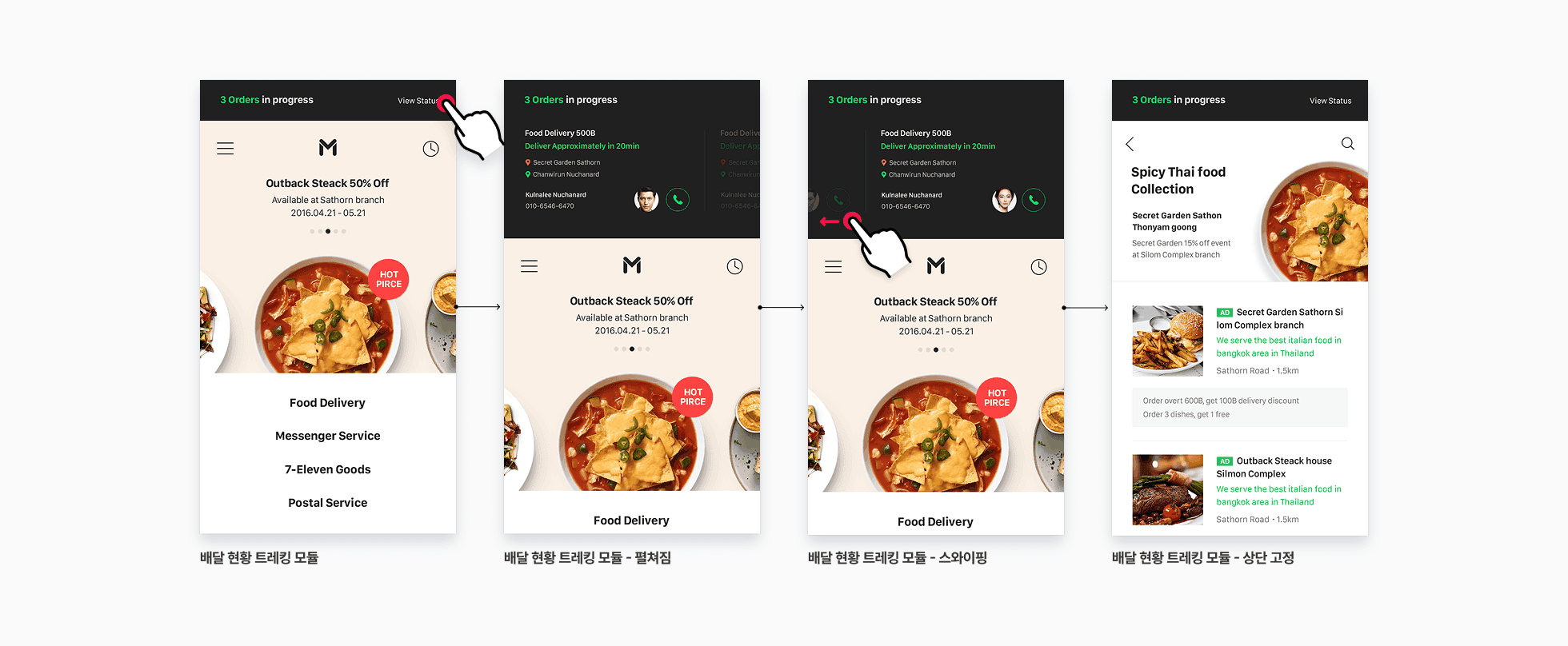 또한 복수의 레스토랑에서 동시 주문을 한 경우에도, 스와이프 동작을 통해 각 주문의 배달 상황을 쉽게 전환하며 확인할 수 있도록 했습니다. 또한 배달 기사에게 전화 걸기 기능을 제공하여 유저가 즉각적으로 배달 기사와 통화를 시도 할 수 있는 최단 경로를 제공 하였습니다.