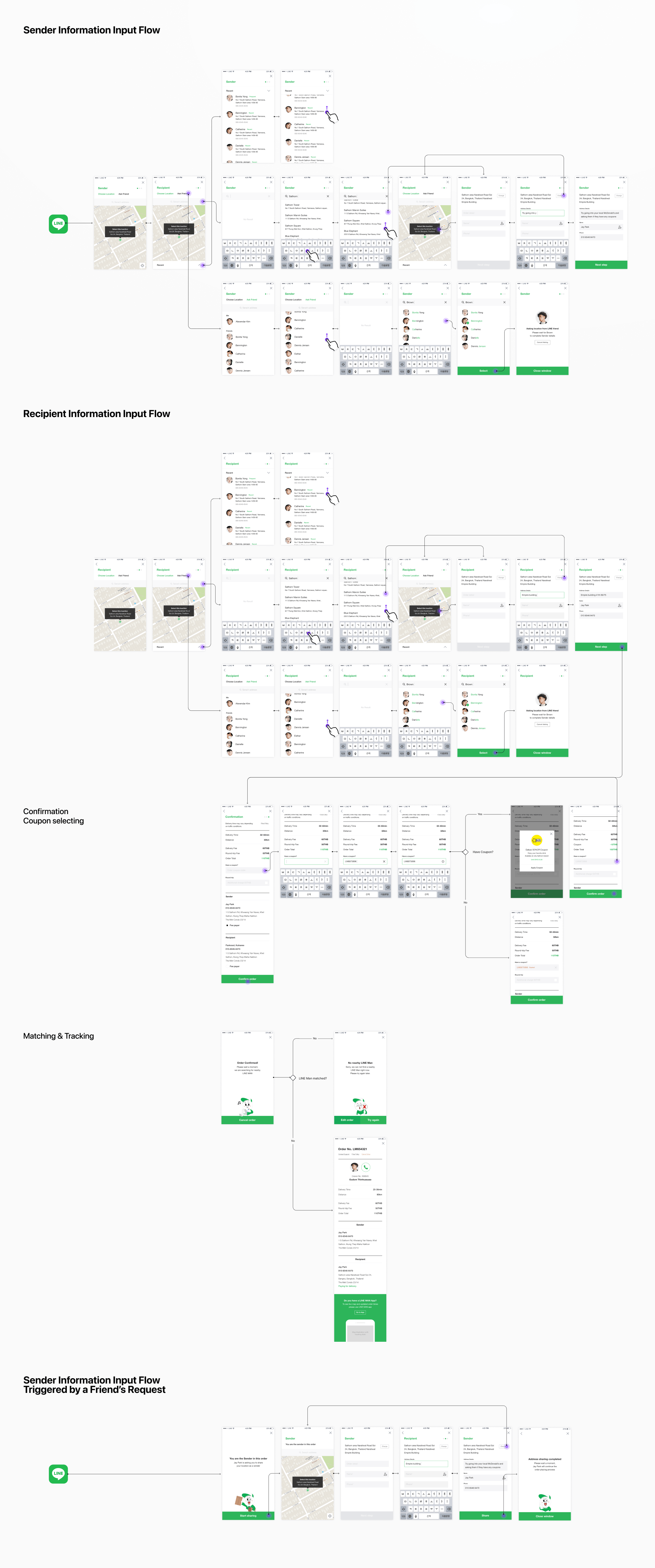 서비스 진입 시, 발신자(Sender)의 주소 입력과 수신자(Recipient)의 주소 입력이라는 두 가지 과업을 신속하게 수행할 수 있도록 동선을 설계했습니다. 또한, 발신자와 수신자 모두 직접 주소를 입력하기 어려운 상황을 해소하기 위해 타인이 대신 주소를 입력할 수 있는 프로세스를 추가했습니다. 이는 택배를 수거하거나 배송해야 하는 주소를 알지 못하더라도 서비스를 예약해 두고, 해당 주소를 알고 있는 라인 친구에게 입력을 요청할 수 있도록 지원하는 케이스입니다.