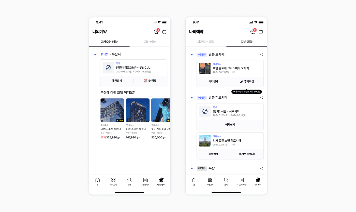 이러한 이용 흐름을 활용해, 예약된 상품이 위치한 지역과 연계된 다른 상품을 크로스셀링할 수 있는 공간을 마련하는 방향을 설정했습니다. 이에 My 섹션의 명칭을 ‘나의 예약’으로 변경하고, 해당 영역에 ‘다가오는 예약’과 ‘지난 예약’을 타임라인 형태로 제공함과 동시에, 관련 상품을 추천하는 기능을 새롭게 추가했습니다.