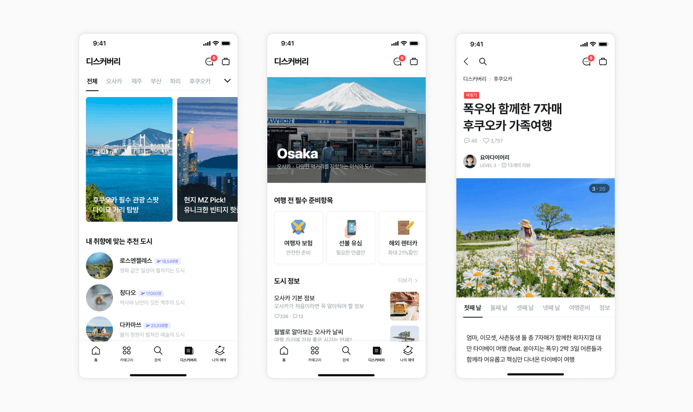 이에 따라 POI 중심으로 여행 컨텐츠를 제공하는 독립적인 공간을 마련하는 방향을 설정 했으며, 바텀 GNB에 ‘디스커버리(Discovery)’ 메뉴를 신설했습니다.